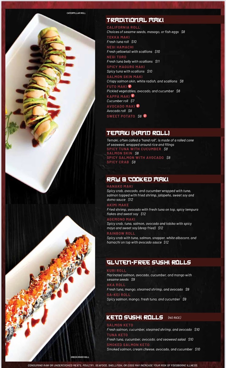Freaky Friday Roll (Raw Sushi Roll) (Fresh Salmon, Snapper,Spicy Tuna,Cucumber Topped With Albacore Tuna, Tobiko And Sauce)